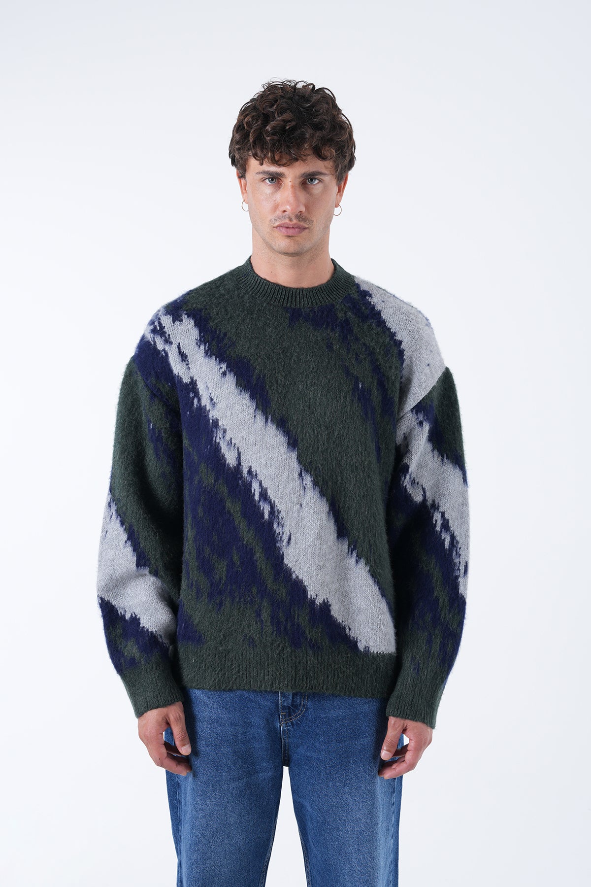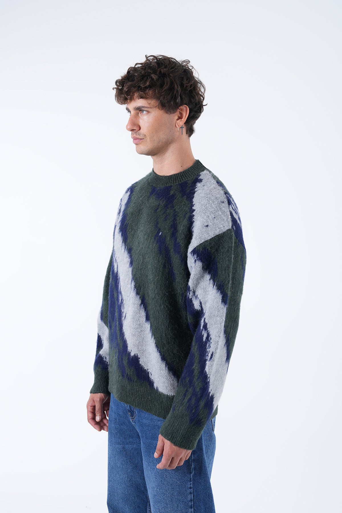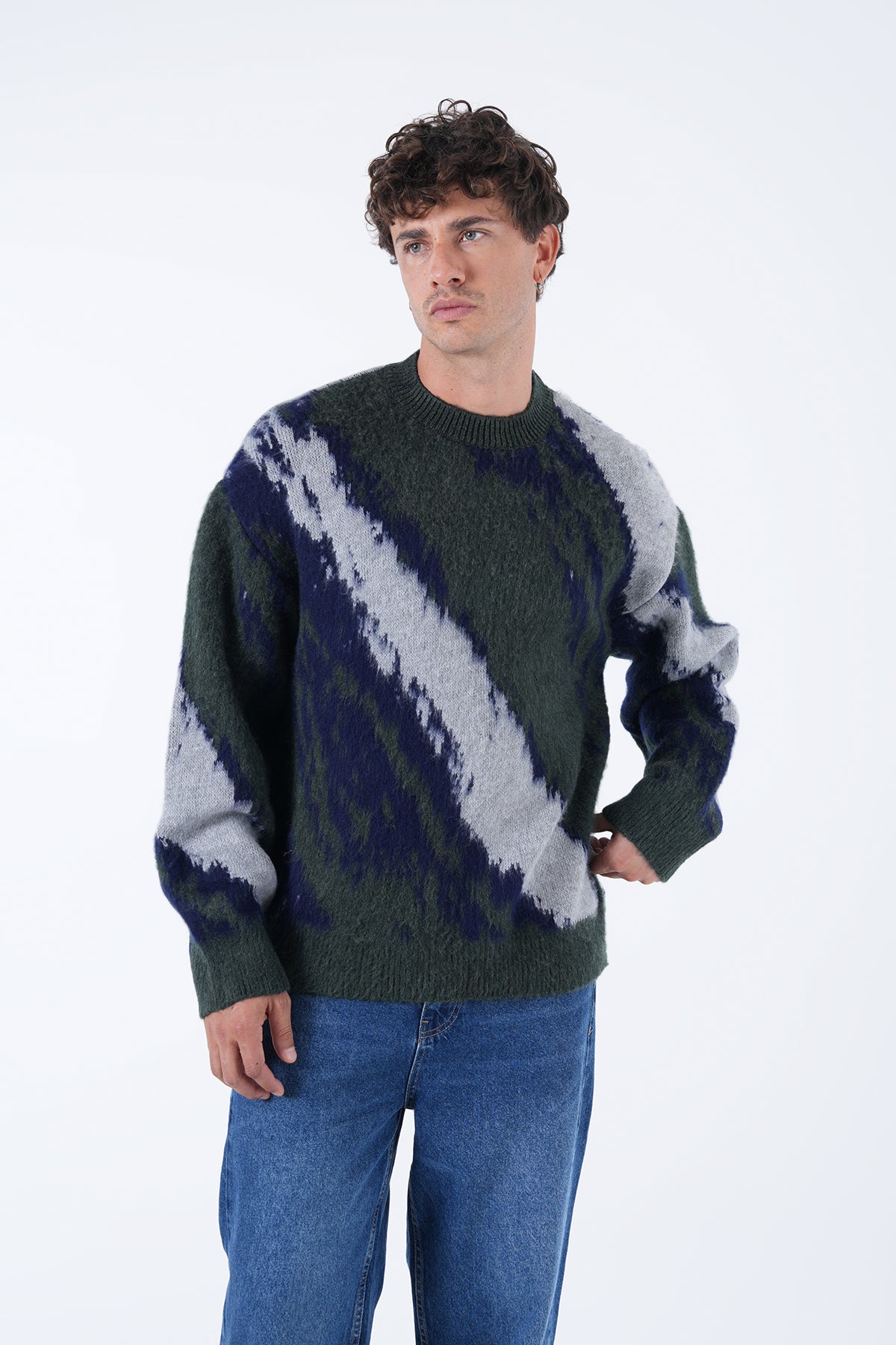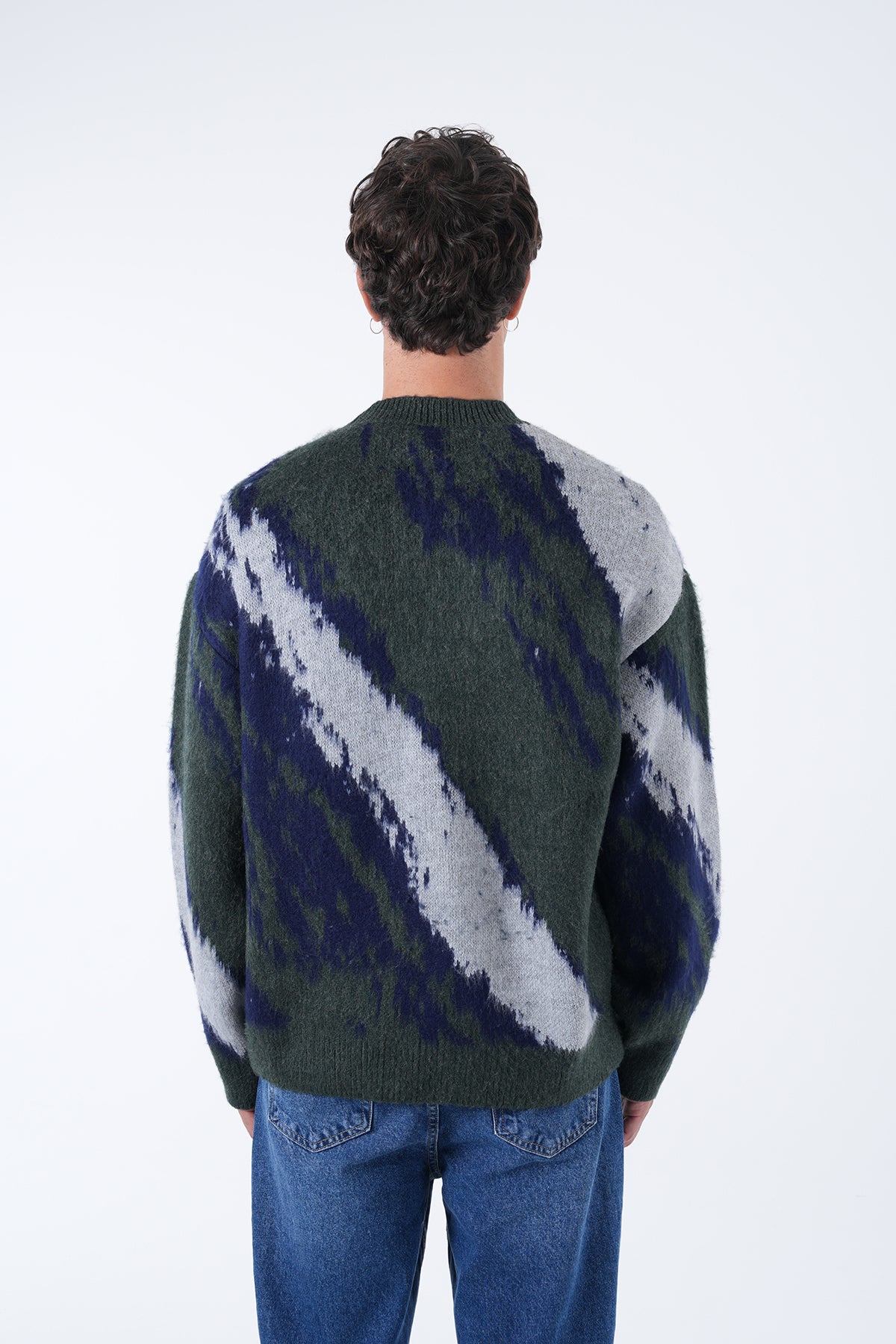 Modern silüet için yuvarlak yaka ve Oversize kalıp. Yumuşak ve konforlu bir his sunan tüylü ve şardonlu triko dokuya sahiptir. Kazak, dikkat çekici soyut deseni ile stilinize dinamik bir görünüm katmak üzere tasarlanmıştır.
