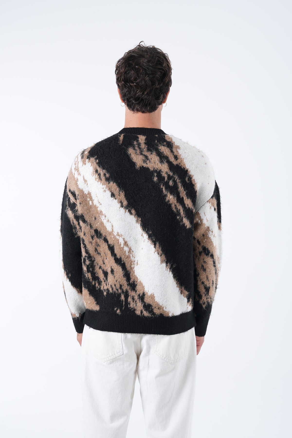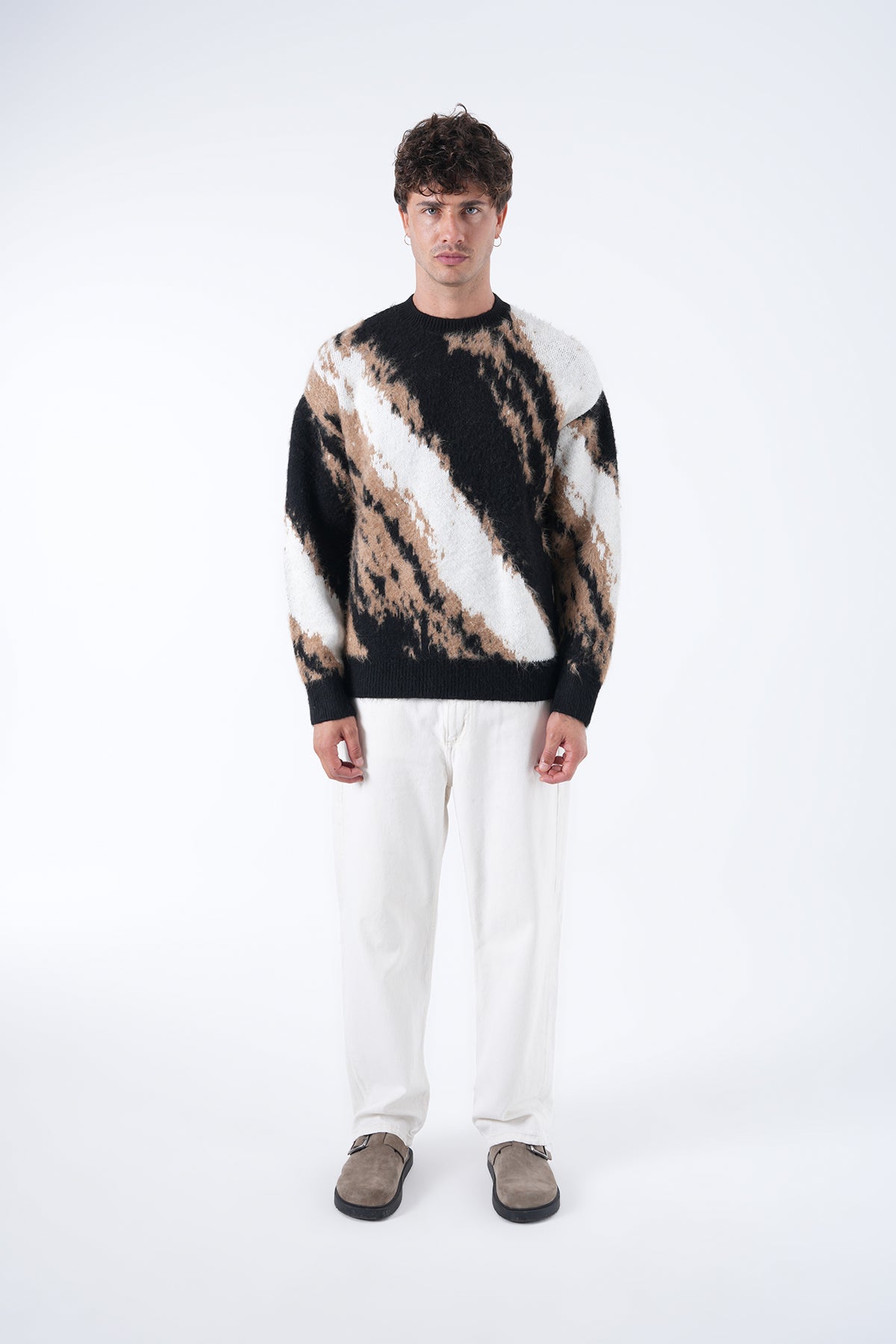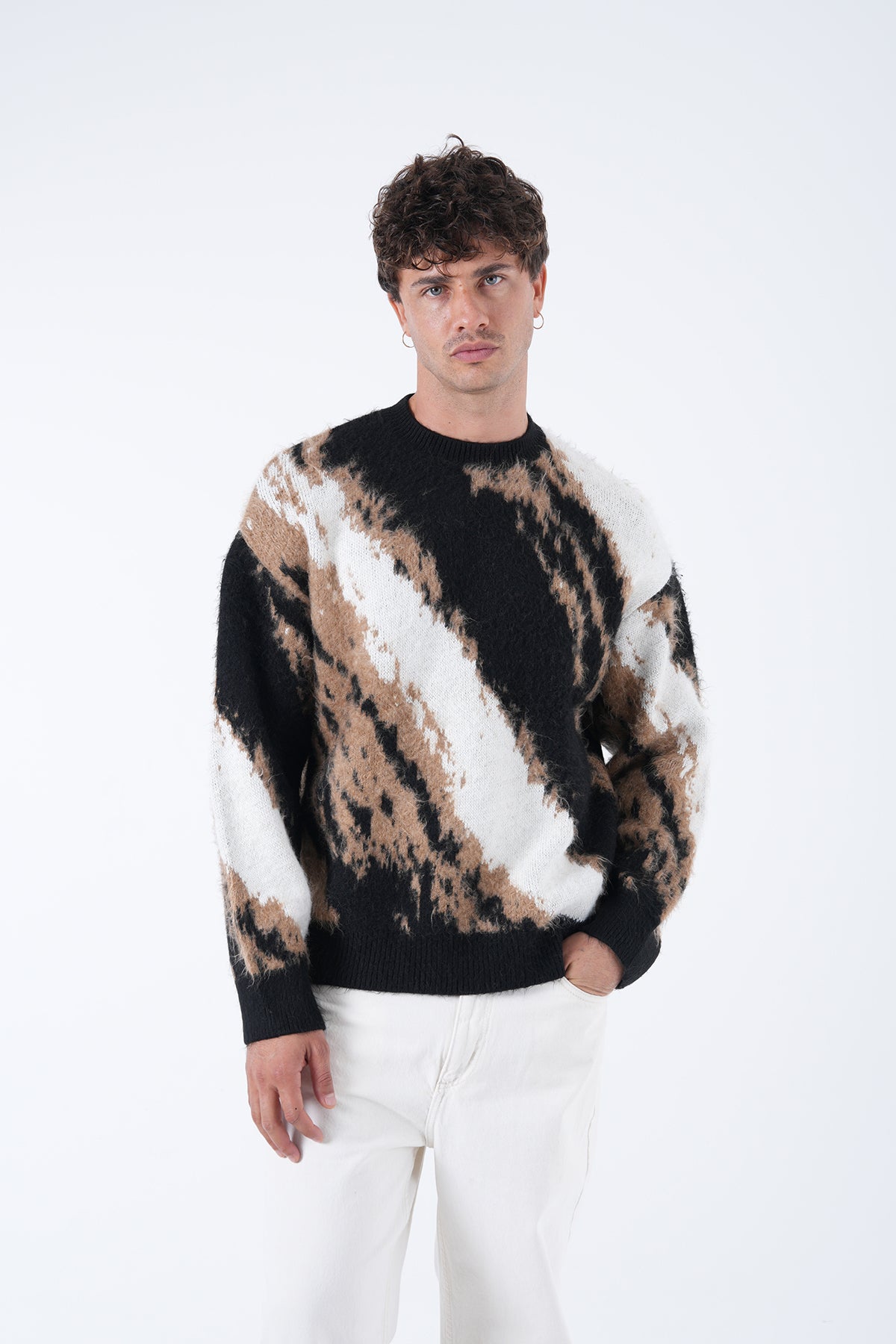 Modern silüet için yuvarlak yaka ve Oversize kalıp. Yumuşak ve konforlu bir his sunan tüylü ve şardonlu triko dokuya sahiptir. Kazak, dikkat çekici soyut deseni ile stilinize dinamik bir görünüm katmak üzere tasarlanmıştır.