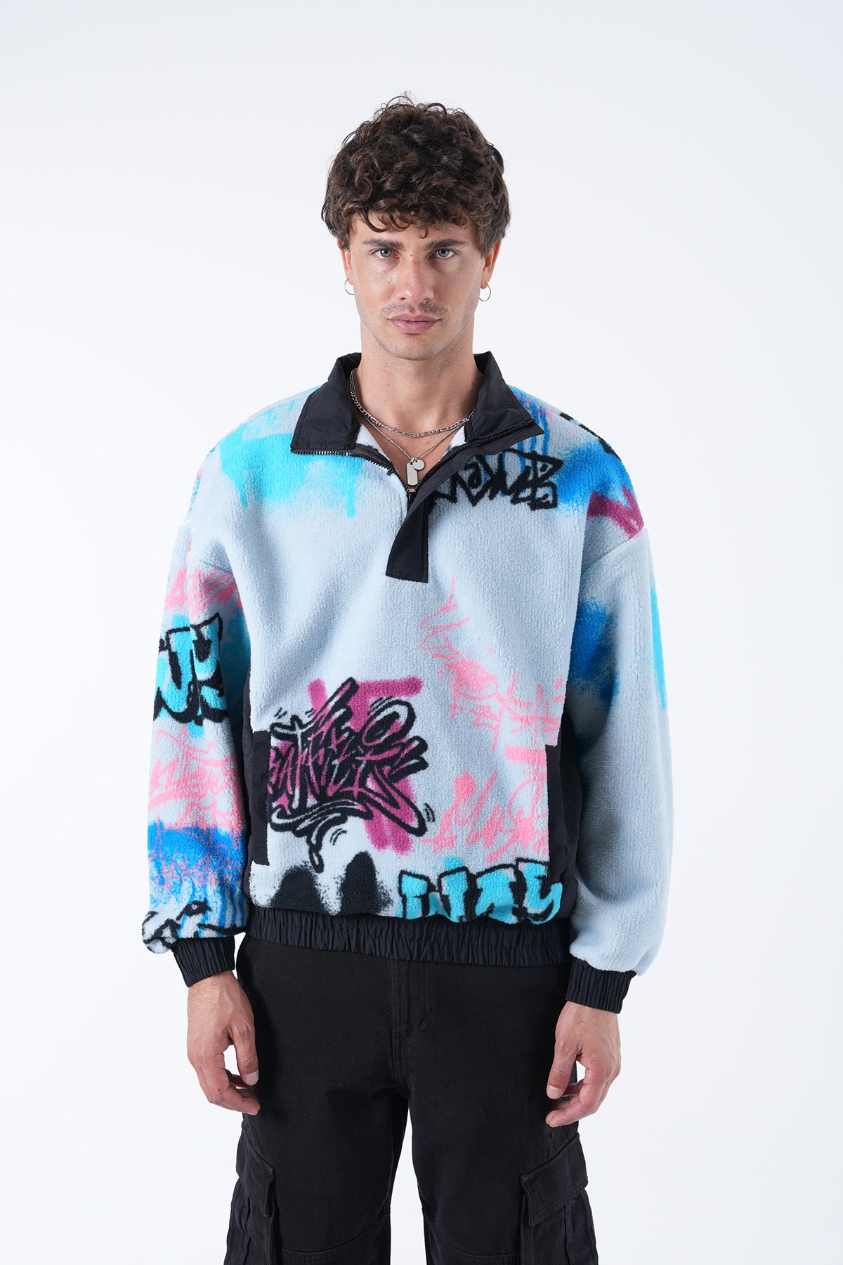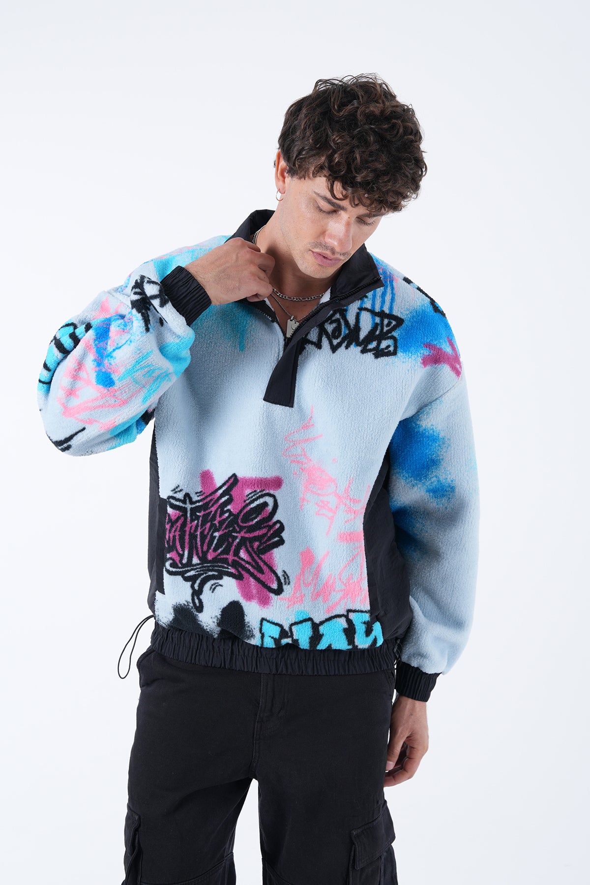 Grafiti Desen Yarım Fermuarlı Polar Sweatshirt