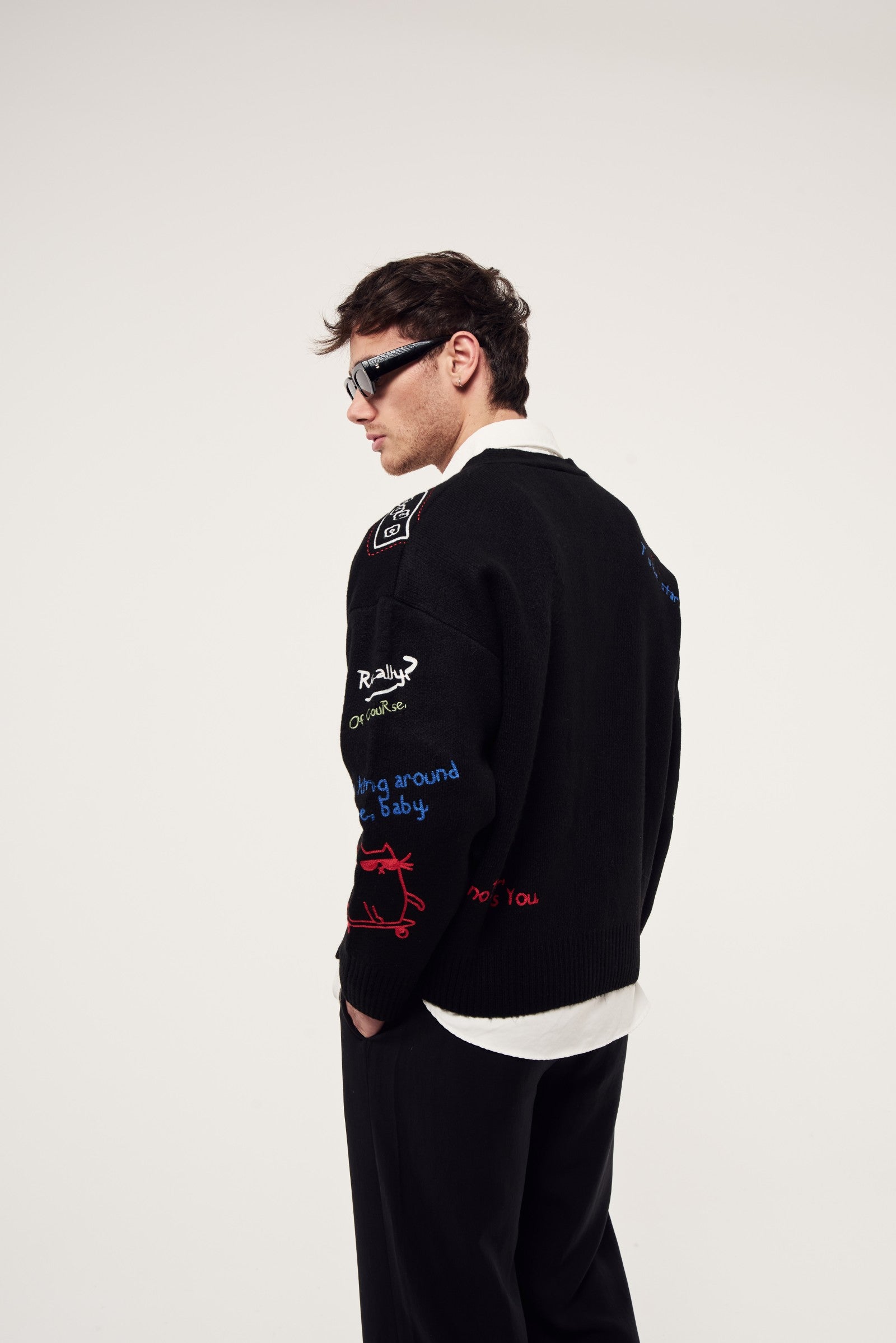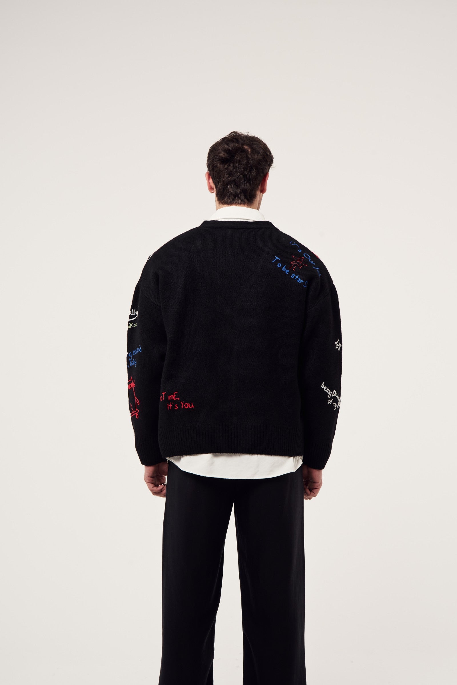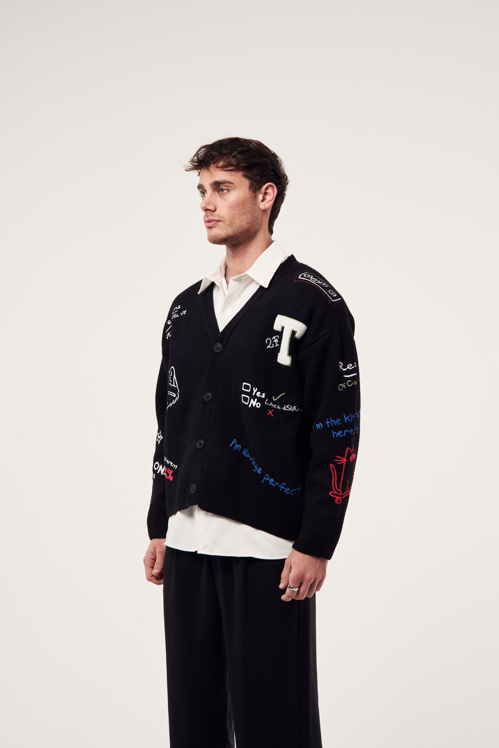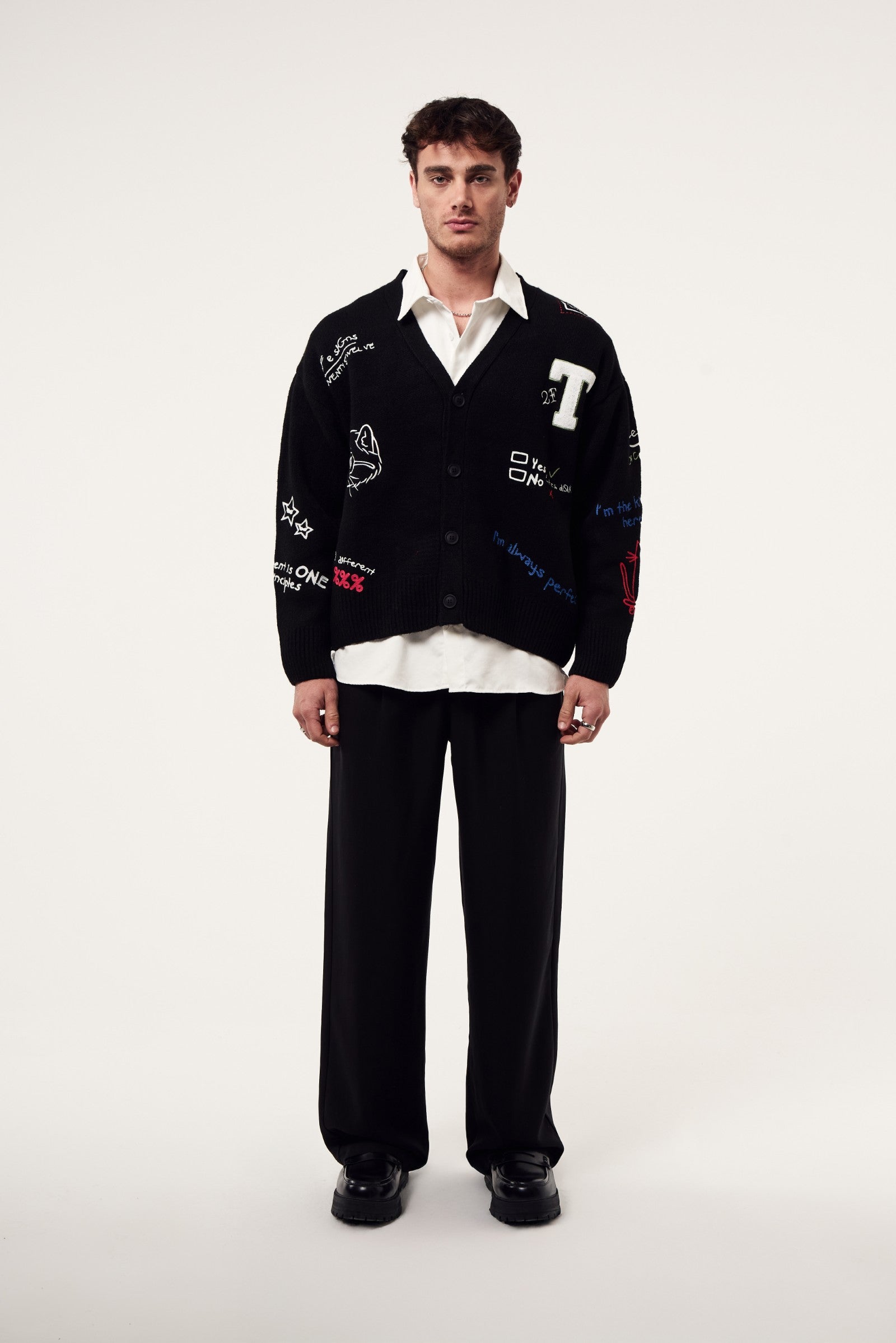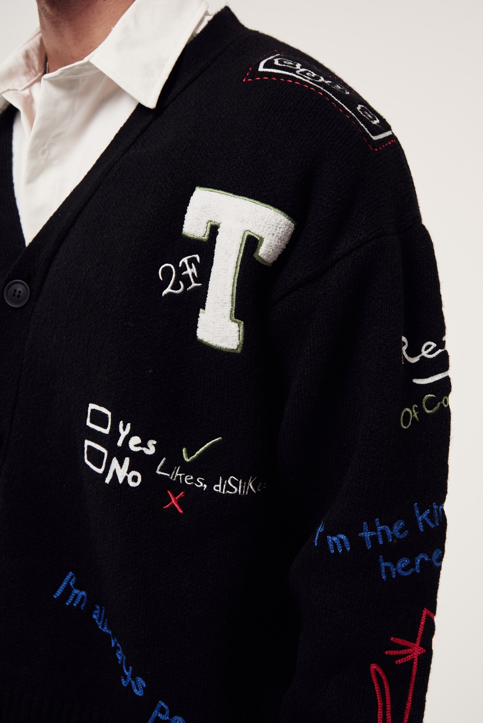 Yumuşak örgü yapısına sahip triko kumaştan üretilmiş, V yaka hırka. Ön kısımda kumaşla uyumlu siyah düğme kapama ve kontrast renkli nakış detayları. Düşük omuzlu tasarım ve geniş kesimli kol yapısı. Düz bitişli manşet ve etek ucuna sahip, vücuda oturmayan dökümlü form.
