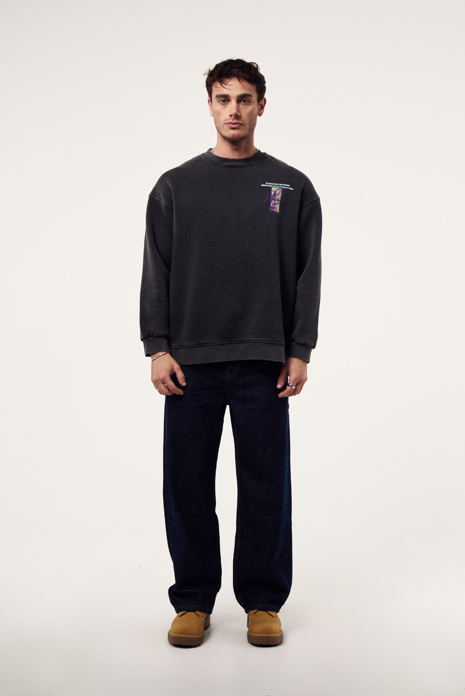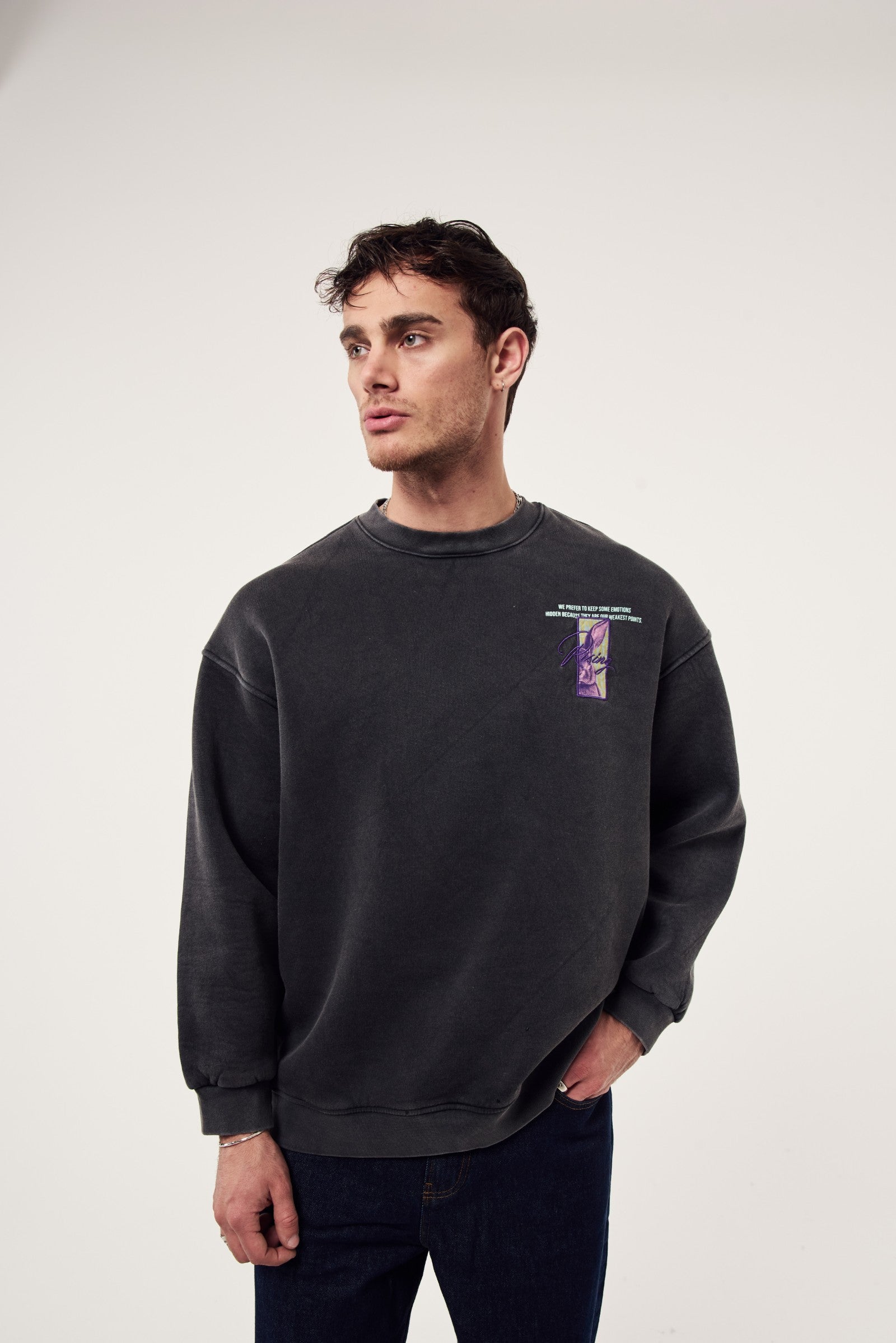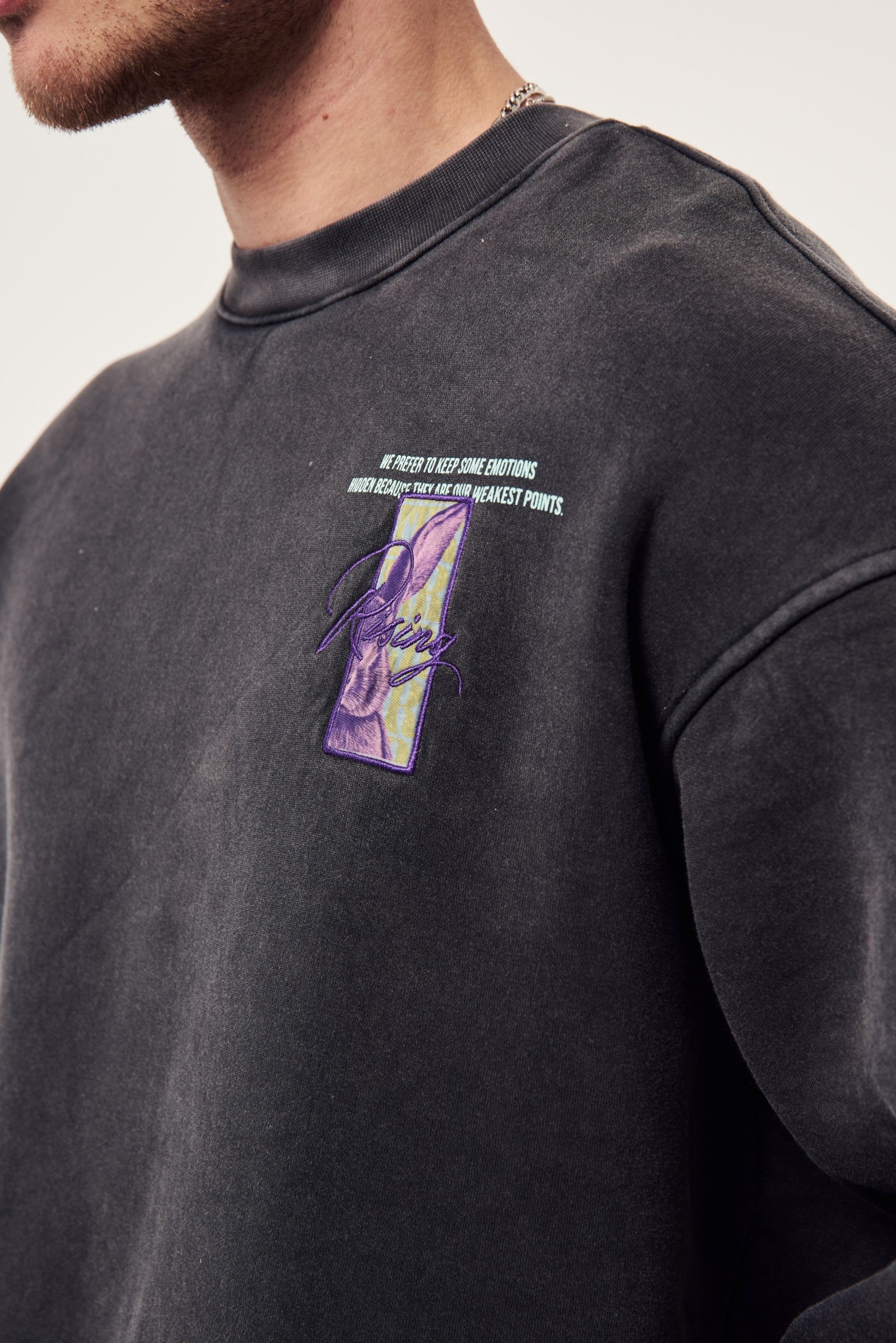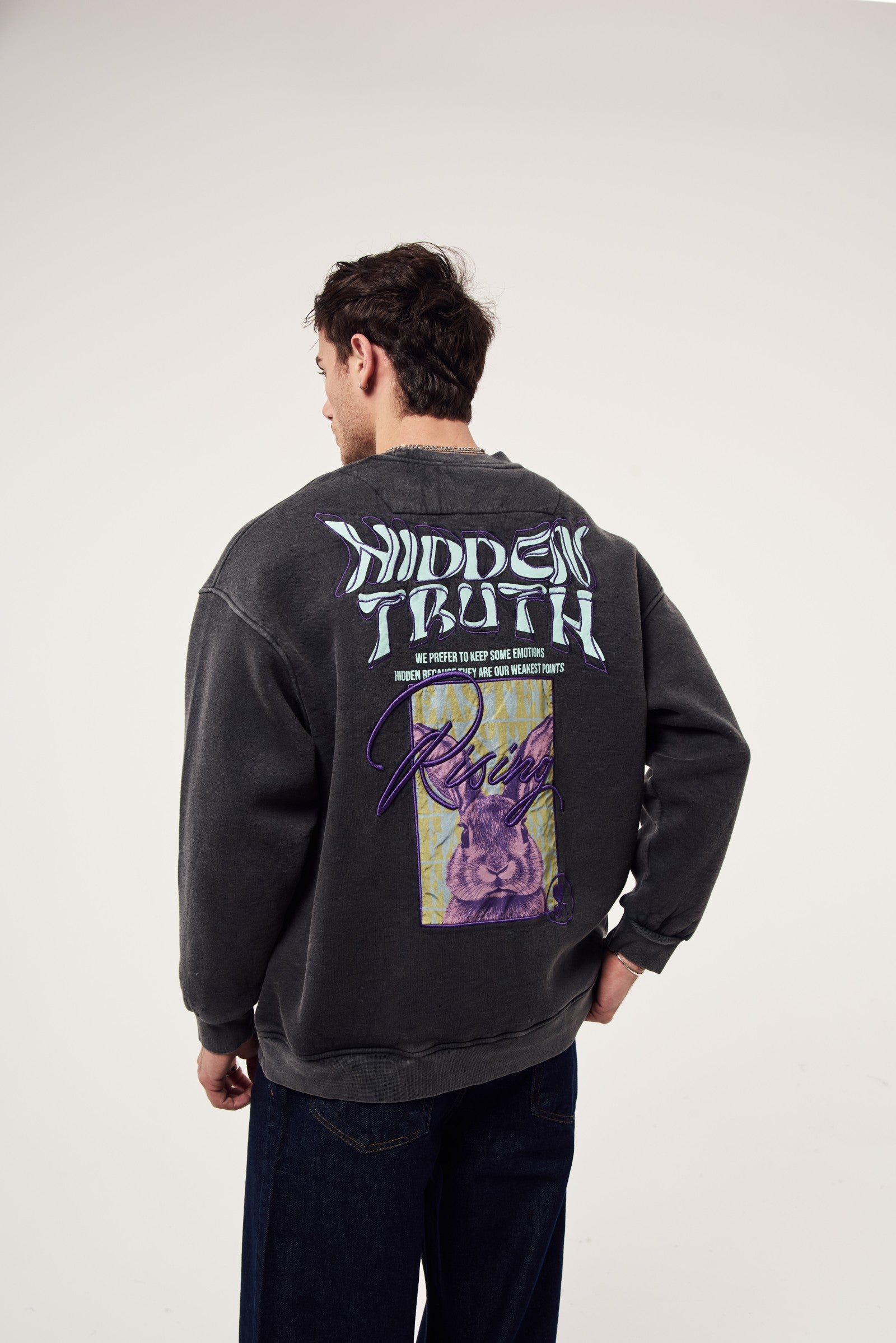 Özel yıkama tekniği ile modernize edilmiş, yüksek kaliteli dokuya sahip sweatshirt. Arka panelde karakteristik "Rabbit" grafik baskı detayı. Düşük omuzlu rahat kesim ve uzun kollu tasarım. Konfor ve özgünlüğü bir arada sunan, formunu koruyan tok kumaş yapısına sahip oversize form.