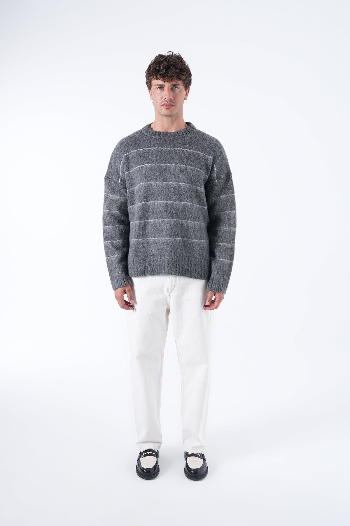 Uzun kollu, yuvarlak yakalı ve rahat kesimli bu triko kazak, şardonlu dokusu, çizgili deseni ve salaş kesimiyle konforlu ve stil sahibi bir seçim sunuyor.