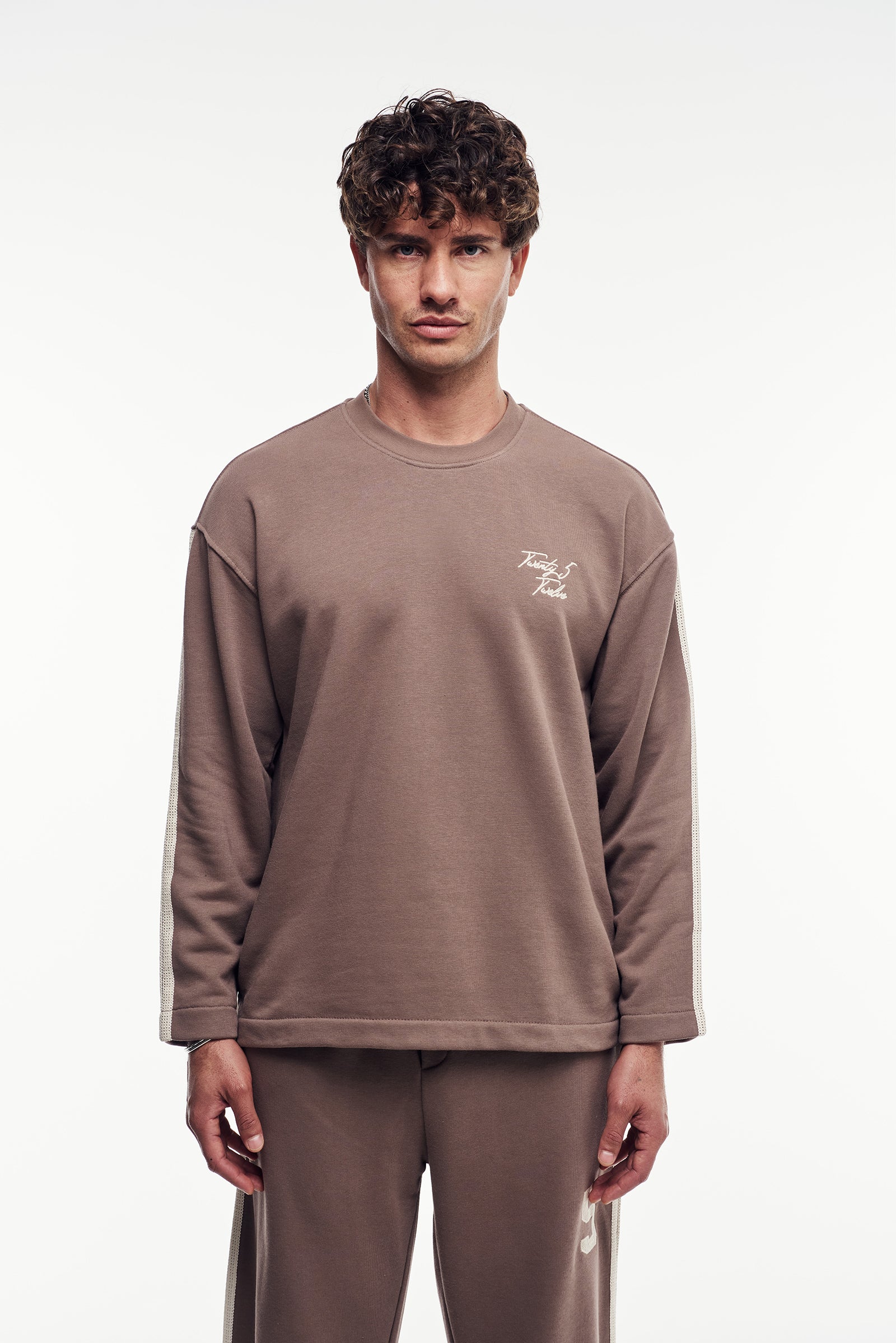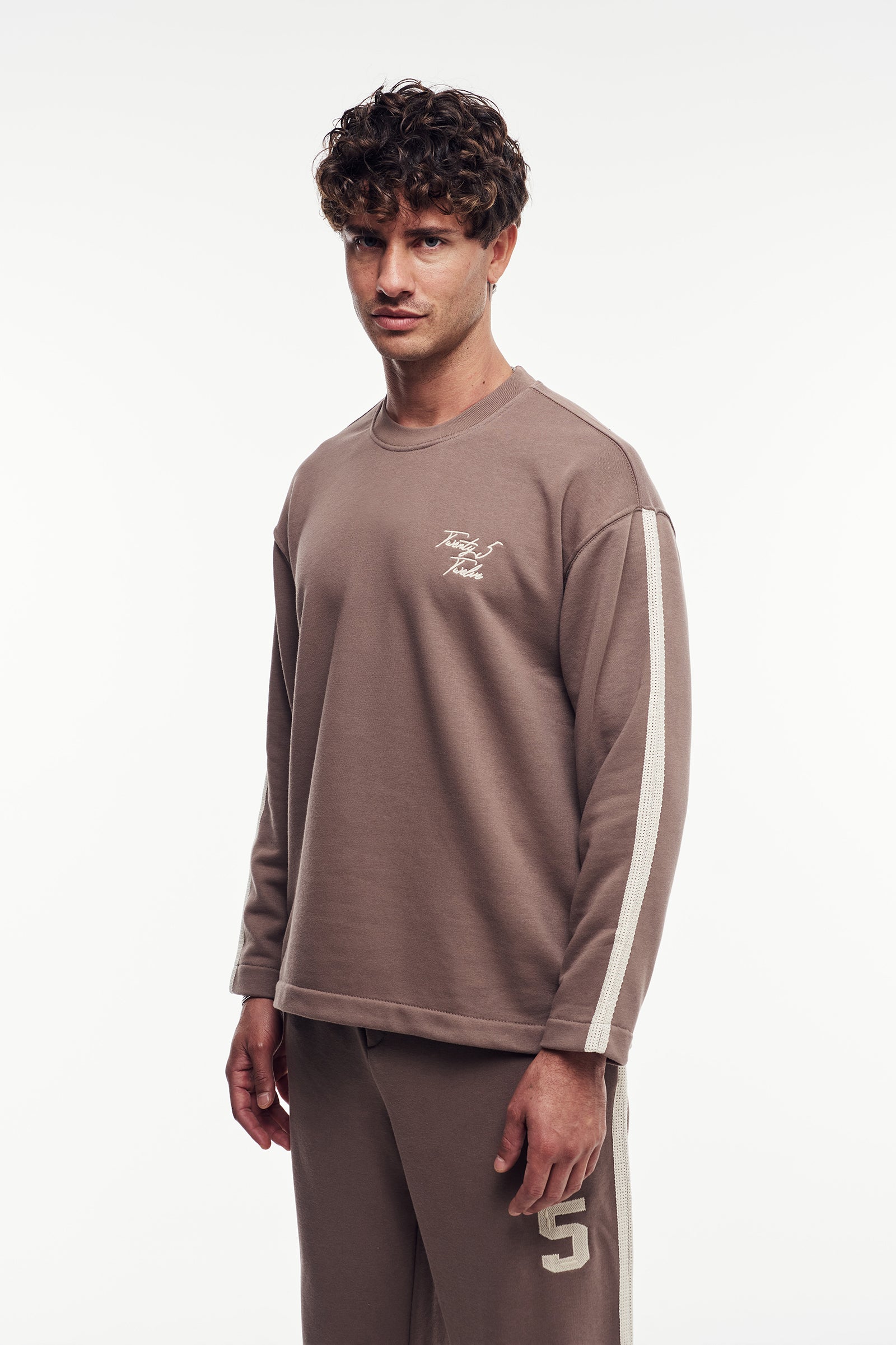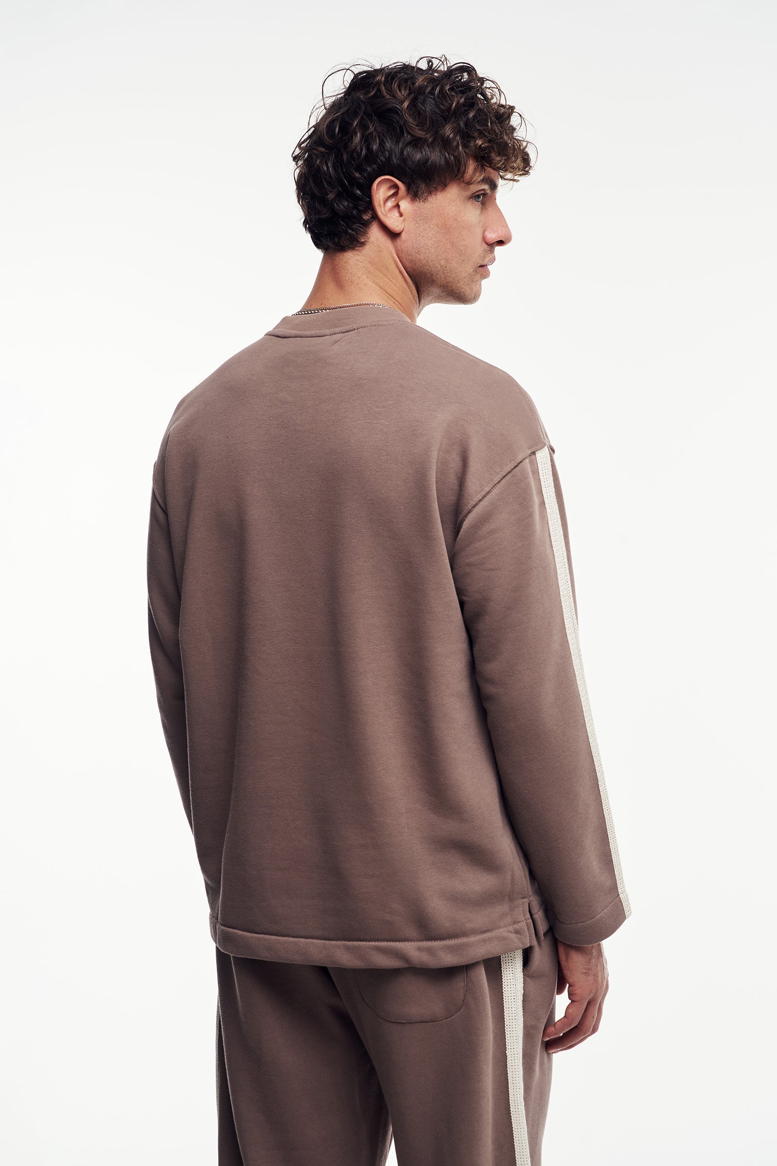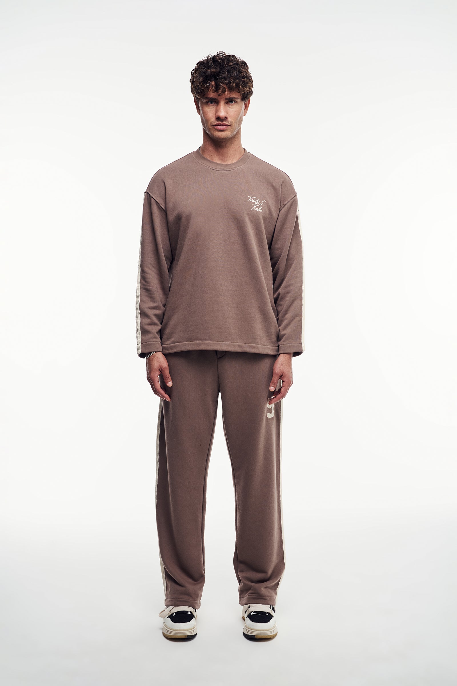 Sweatshirt ve eşofman altından oluşan, iki parçalı rahat takım. Relaxed fit kesimiyle modern ve konforlu bir silüet sunar. Sweatshirt'te bisiklet yaka, eşofman altında ise beli lastikli ve yan cepler bulunur. Her iki parçanın yanlarında şerit detayları yer alır.