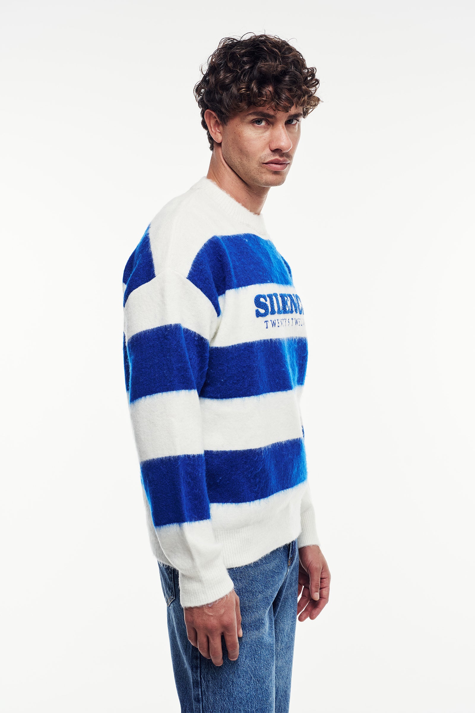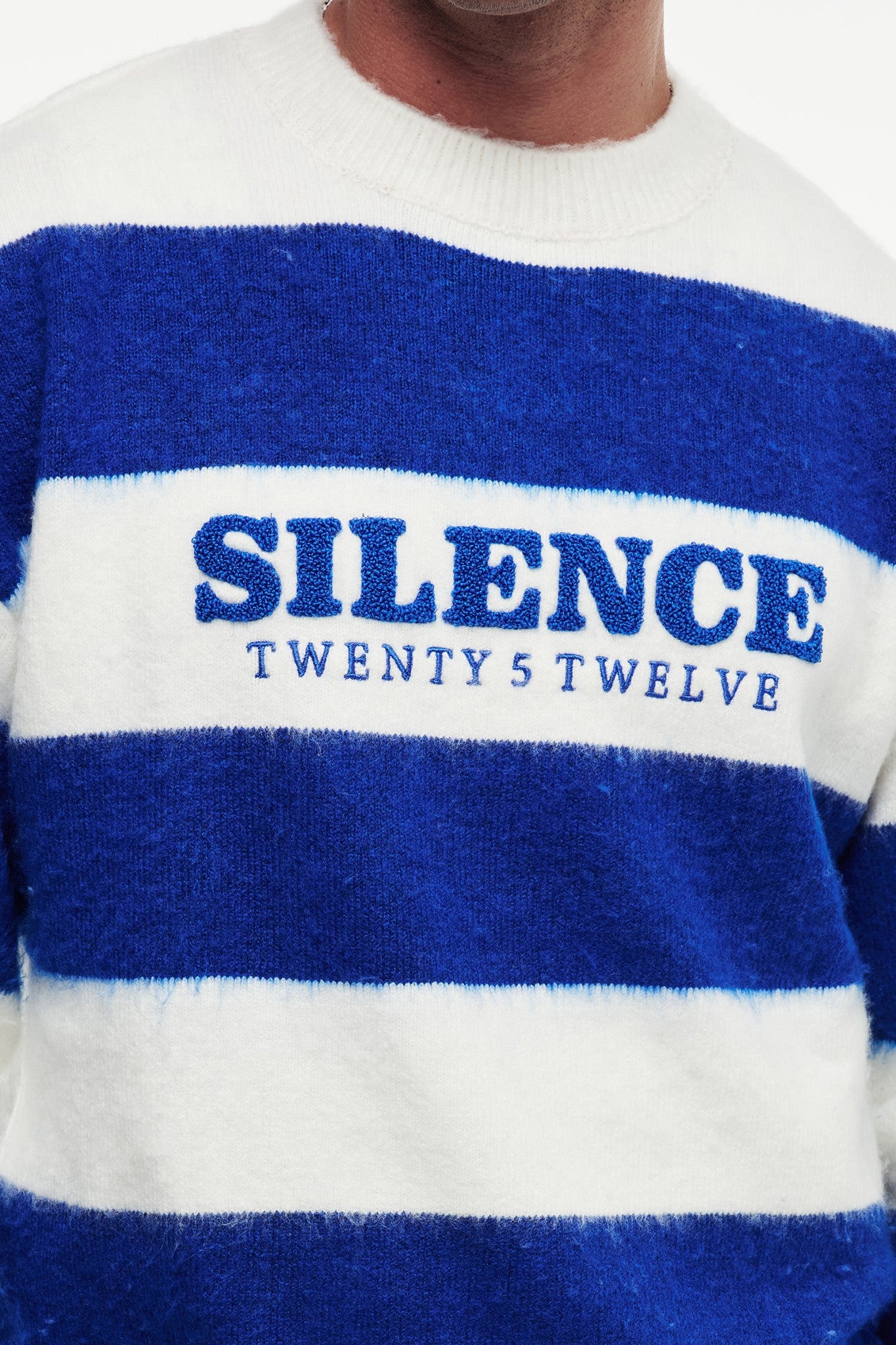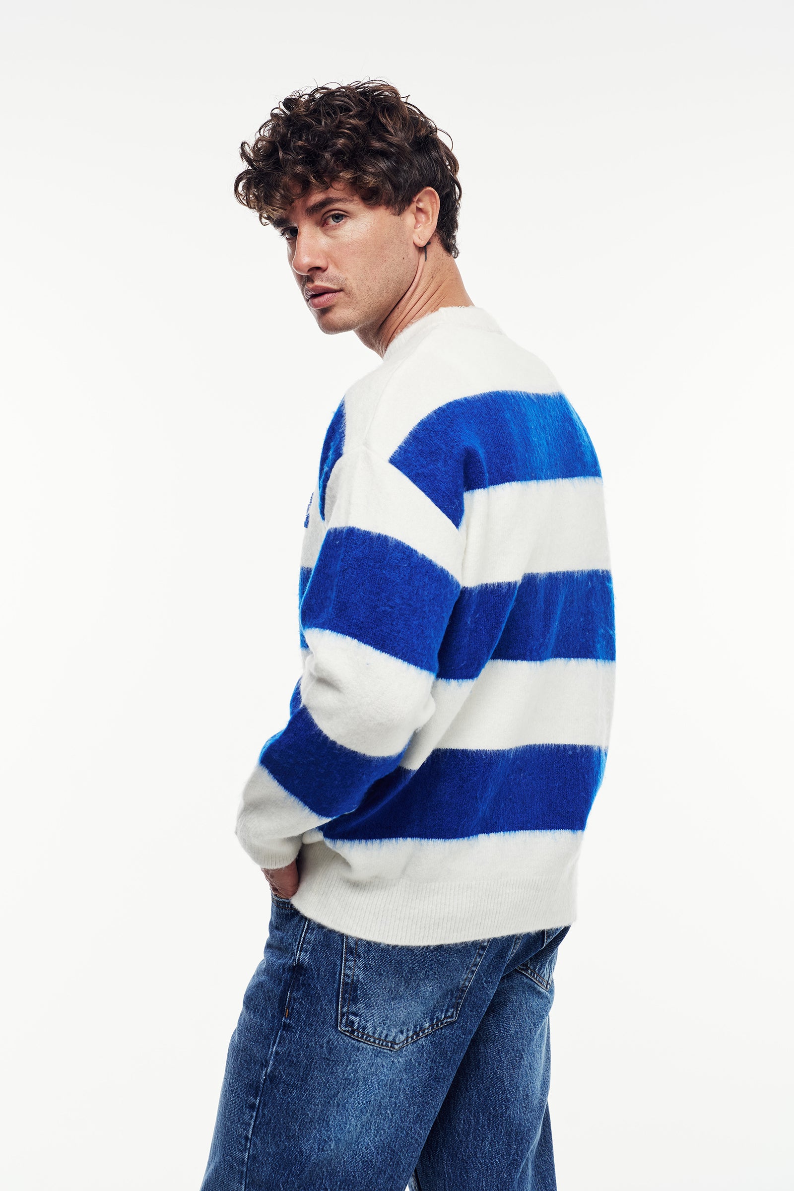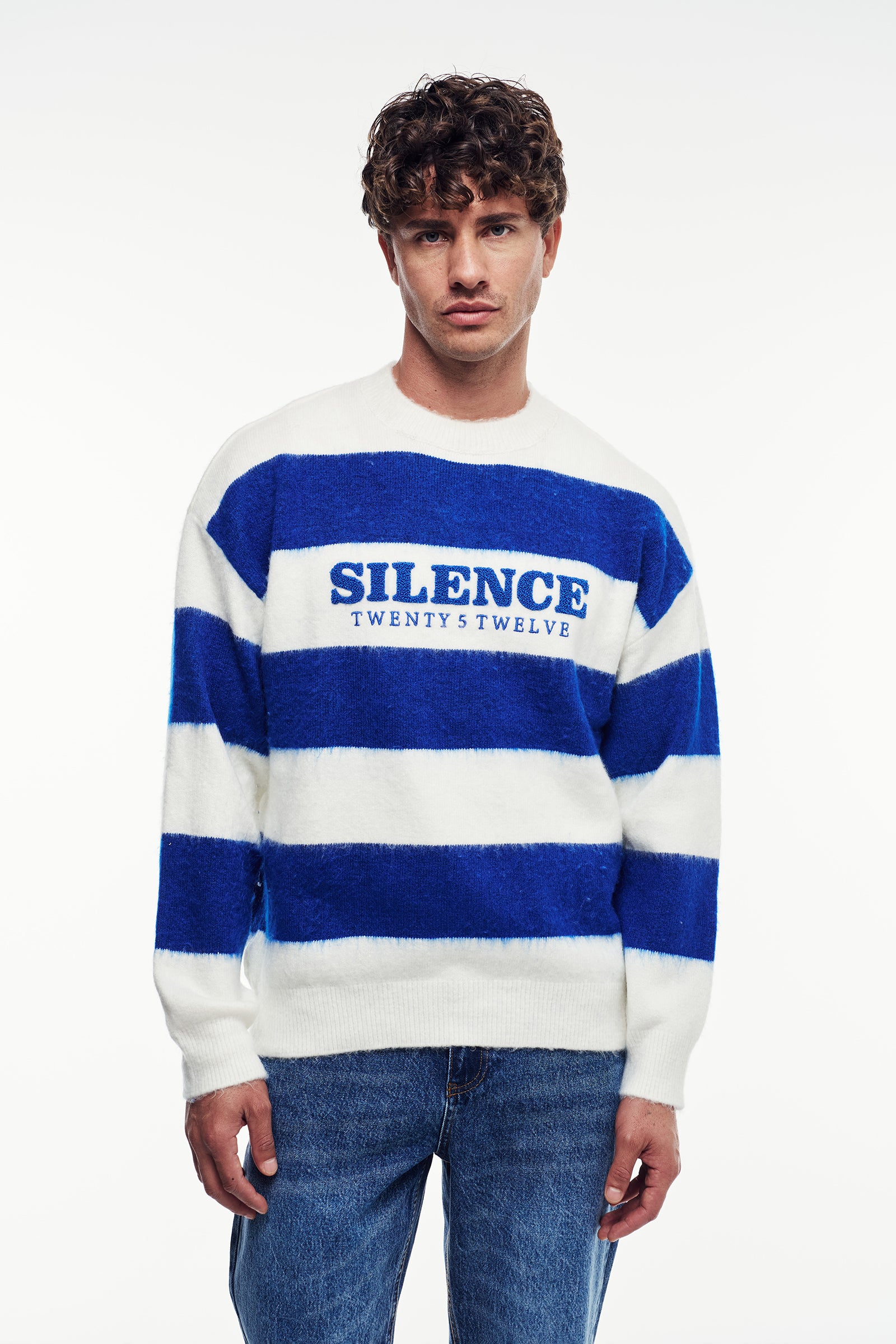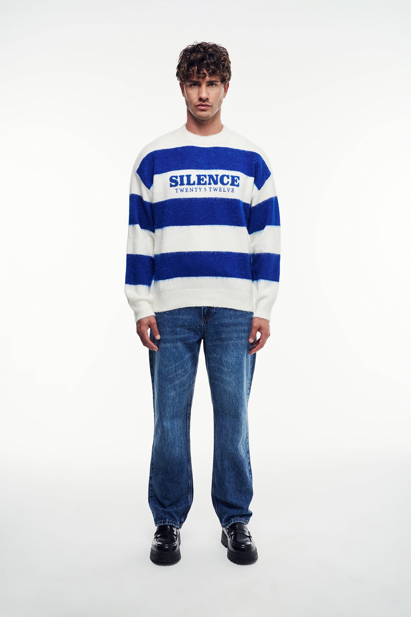 Yumuşak dokulu iplikten, bisiklet yaka triko kazak. Modern bir görünüm için çizgili desene ve rahat kesime sahiptir. Ön kısımda sade kontrast renkte yazı baskısı detayı bulunur. Manşet ve etek ucu fitillidir.