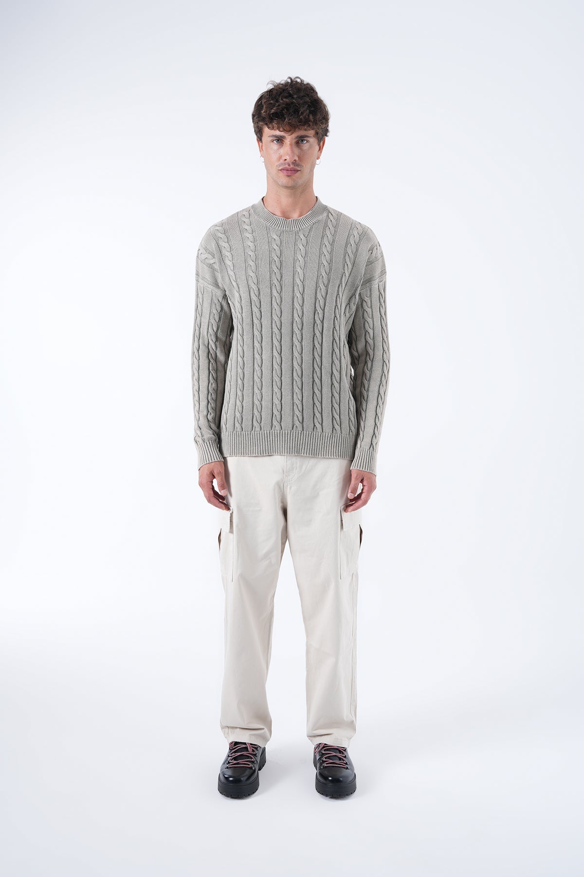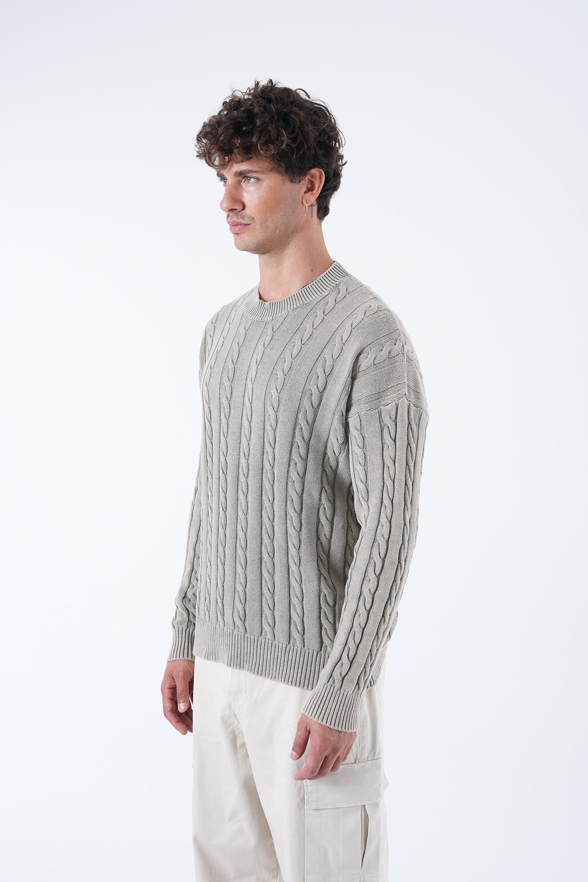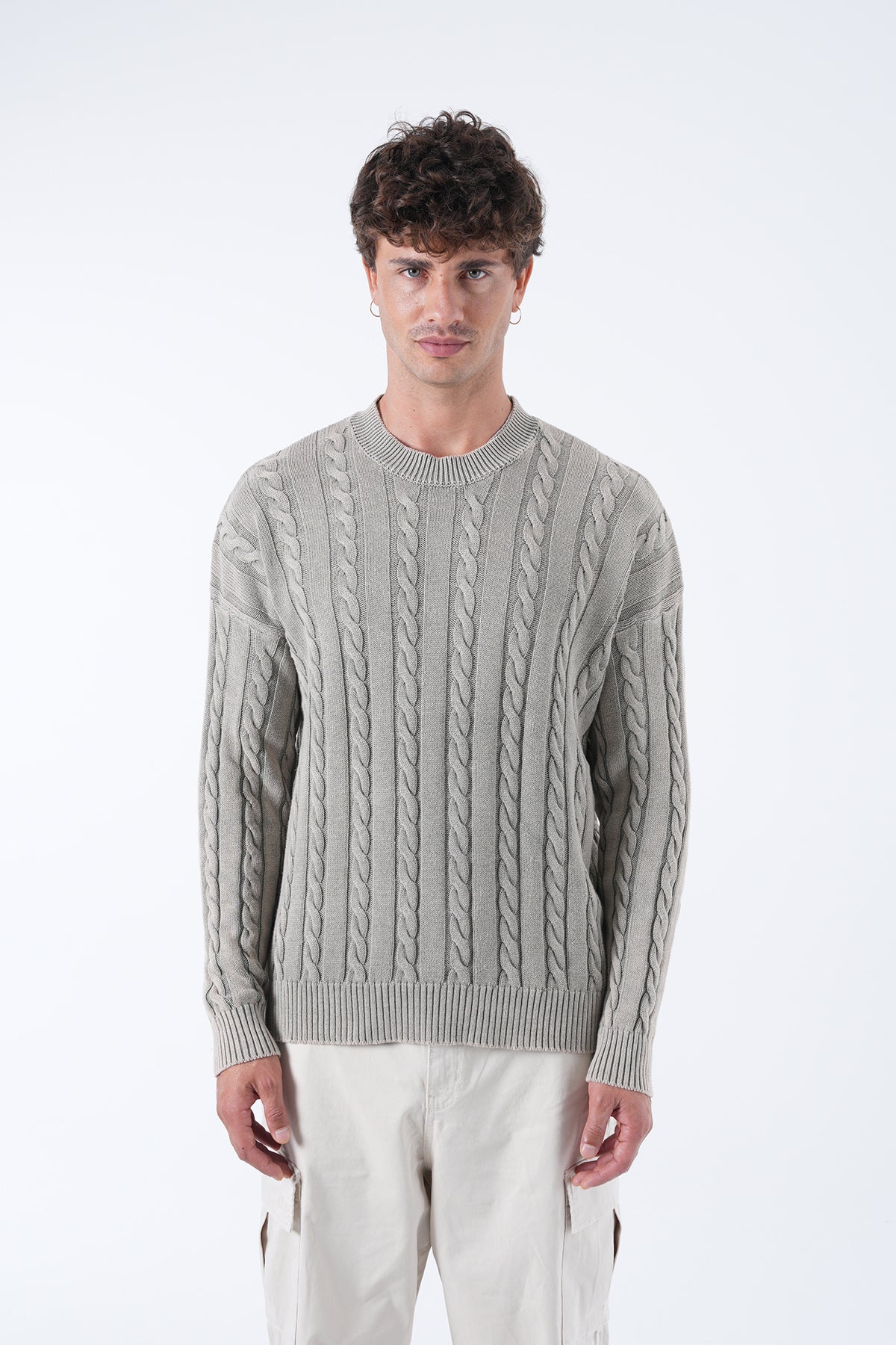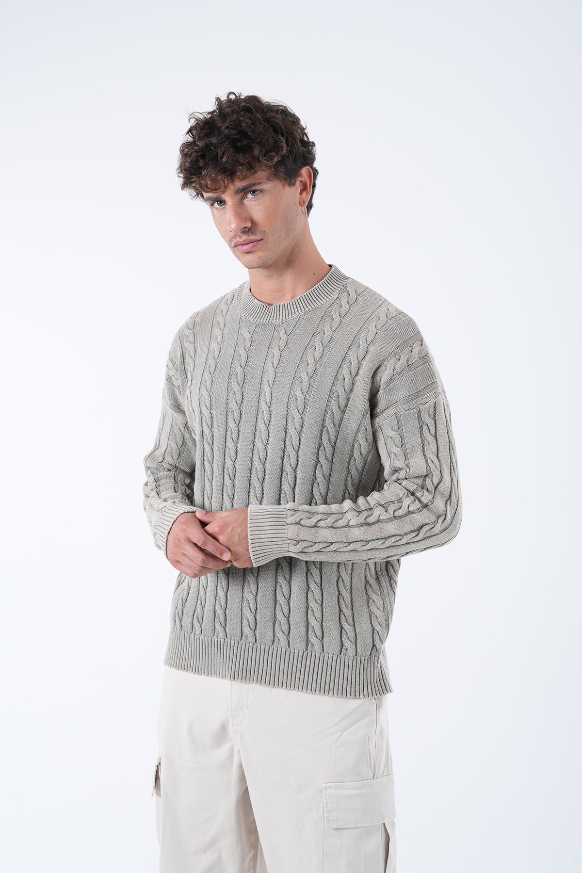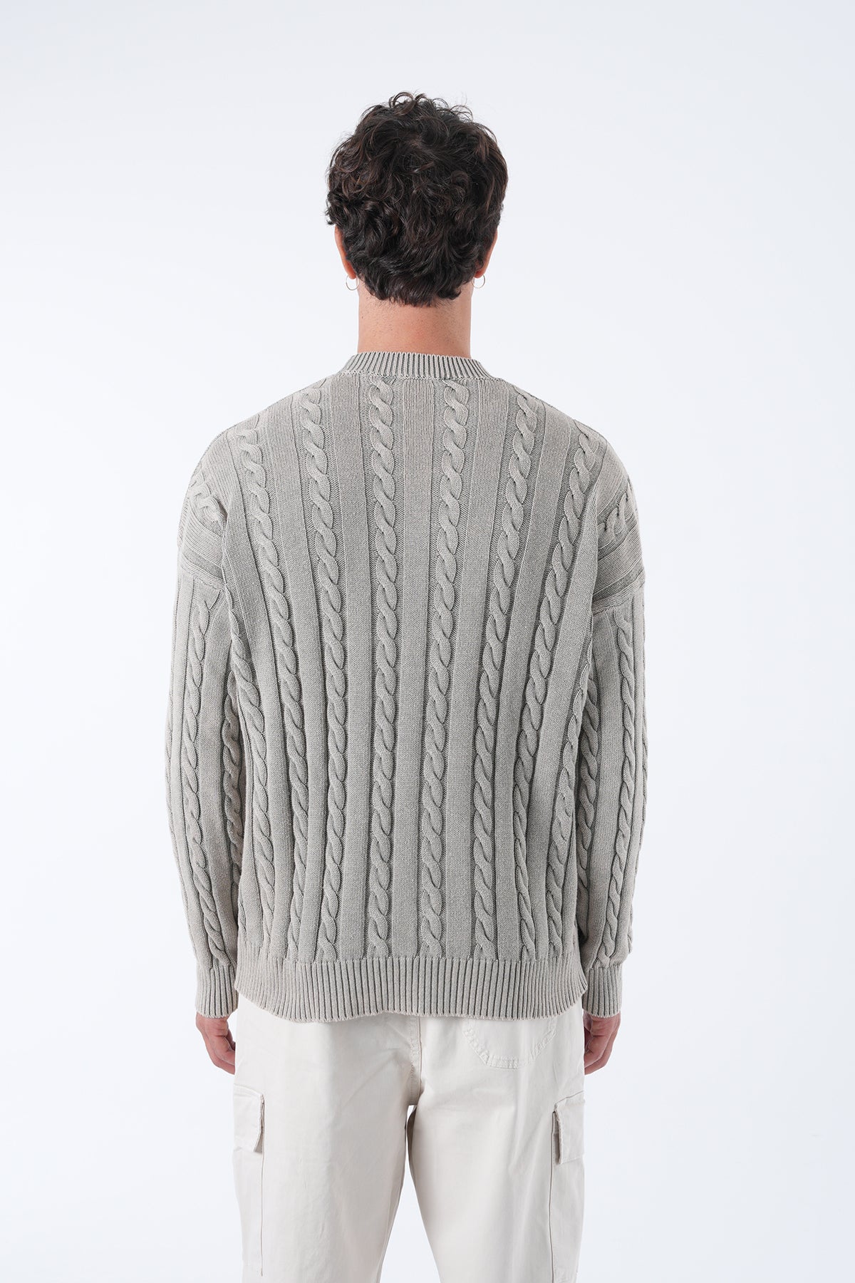 Bisiklet yaka, kısa kollu ve yıkamalı dokulu bu örgü kazak, desenli yapısıyla modern bir görünüm sunuyor.