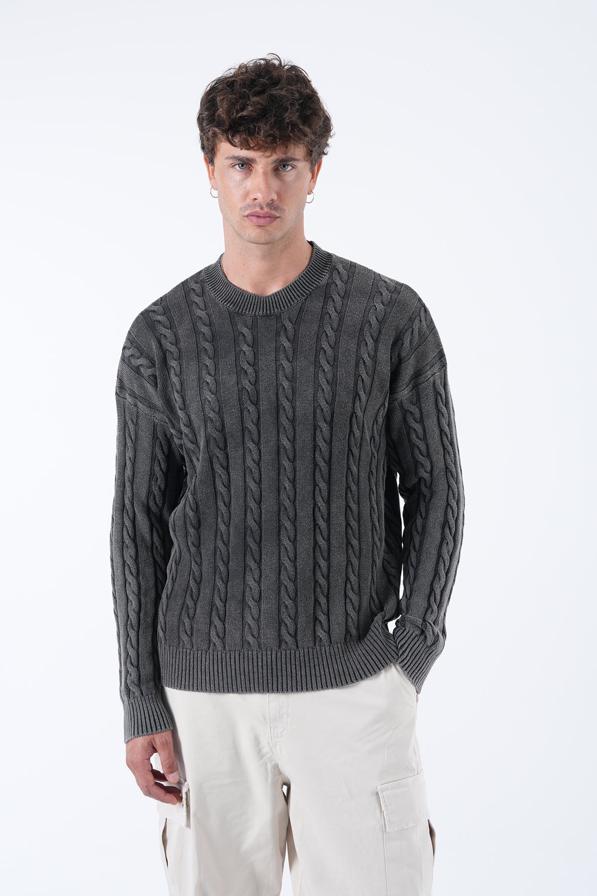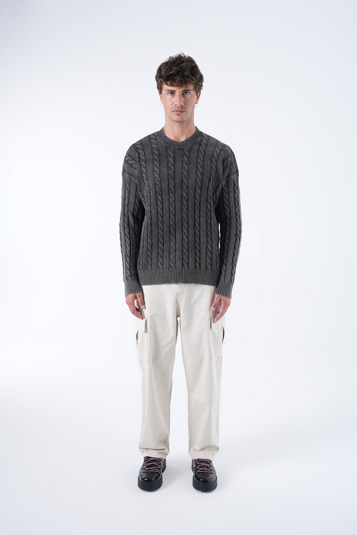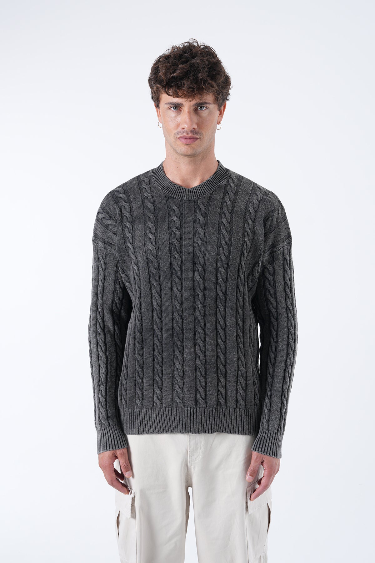 Bisiklet yaka, kısa kollu ve yıkamalı dokulu bu örgü kazak, desenli yapısıyla modern bir görünüm sunuyor.